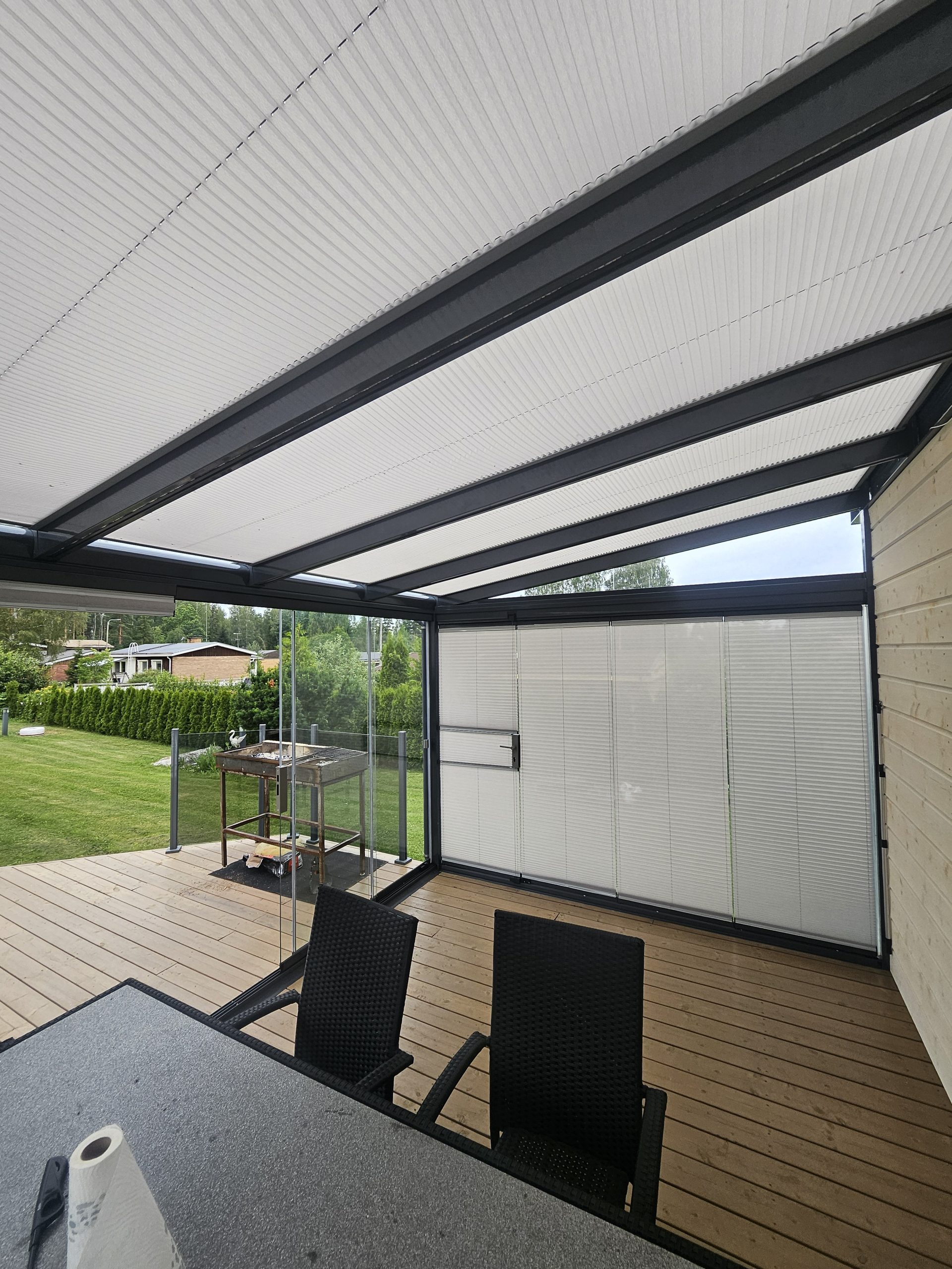 Kyllä, kun tila on lasitettu. Visor-kaihtimet on suunniteltu kestämään lasitetun terassin lämpötilavaihteluita ja normaalia kosteutta. Jos ilma on erityisen kostea, suosittelen pitämään kaihtimet kasassa, jotta vekkimuoto säilyy ryhdikkäänä.
