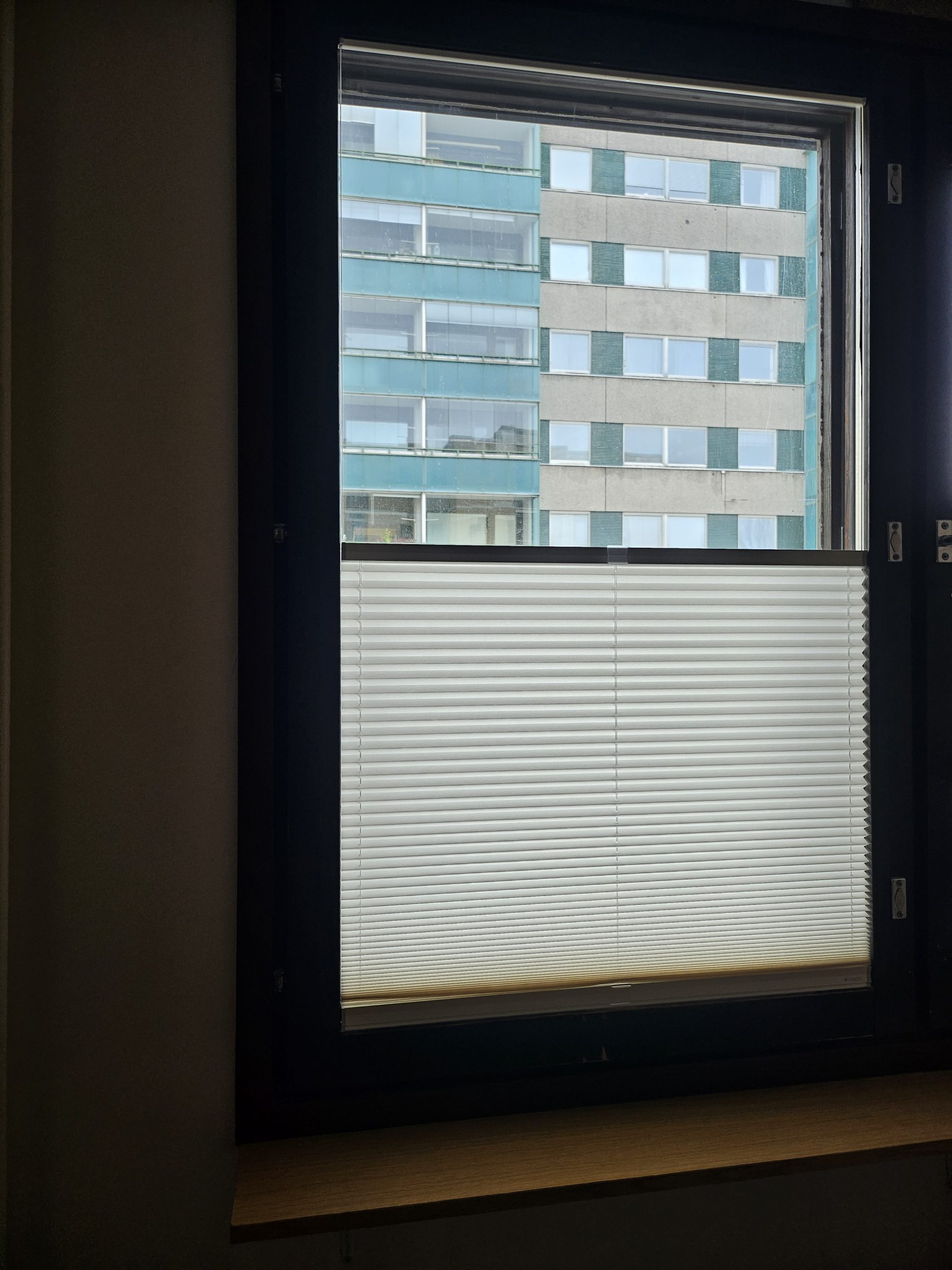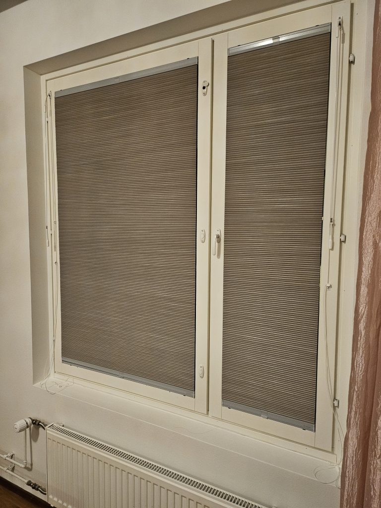 Puhdistus onnistuu helposti pölyhuiskulla tai imurilla kevyellä imuteholla. Kaihtimien sisäpinnan voi myös pyyhkiä kostealla liinalla. Jos kangas kastuu, kaihdin kannattaa sulkea kuivumaan, jotta vekkimuoto säilyy siistinä.
